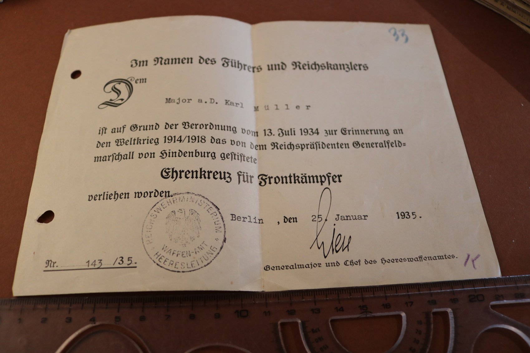 Certificate for the Cross of Honor for Frontline Fighters for a major retired - 1935 Berlin