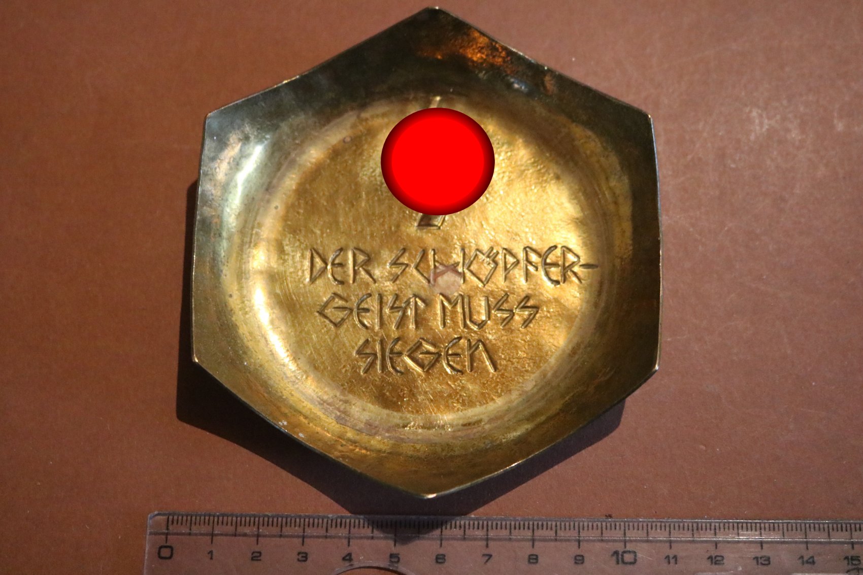 Einzelstück ?  selbstgemachte alte Messingschale mit HJ-Spruch und Rune