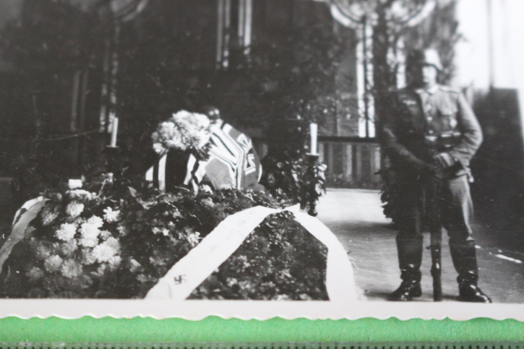 interessantes altes Foto - aufgebahrter Sarg mit Kriegsflaggen und Wache 1940