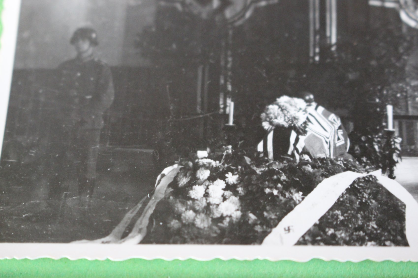 Preview: interessantes altes Foto - aufgebahrter Sarg mit Kriegsflaggen und Wache 1940