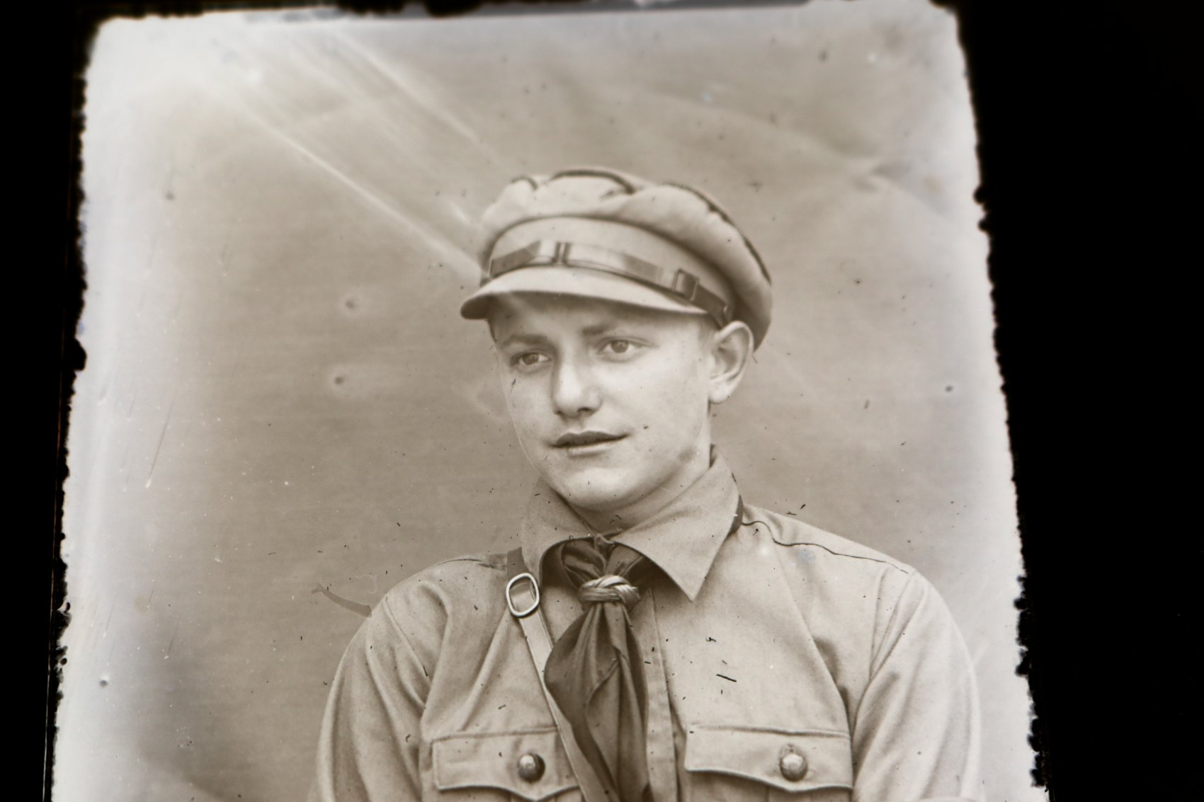 altes Glasnegativ - Hitlerjunge, Pimpf , mit Schirmmütze und Abzeichen