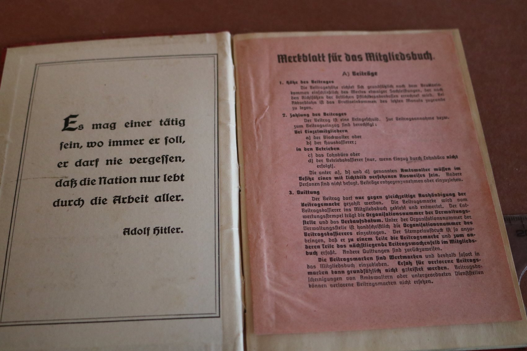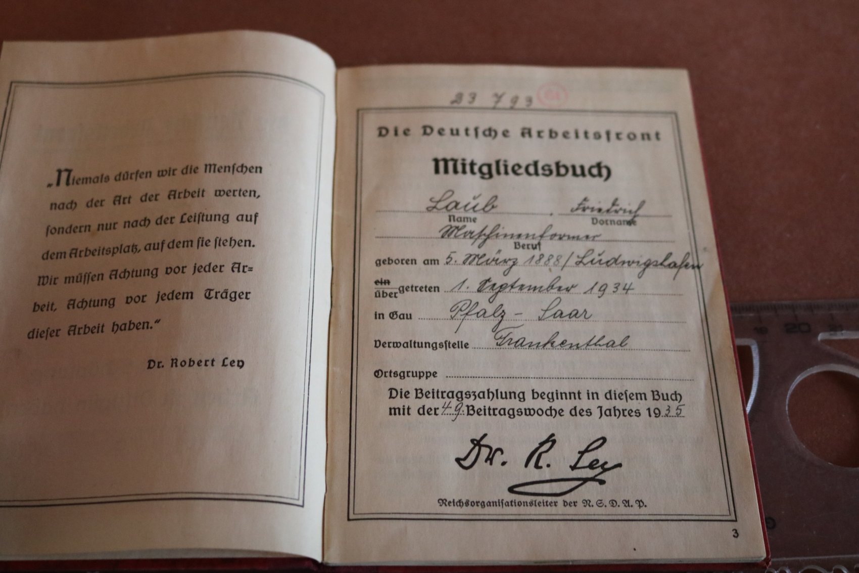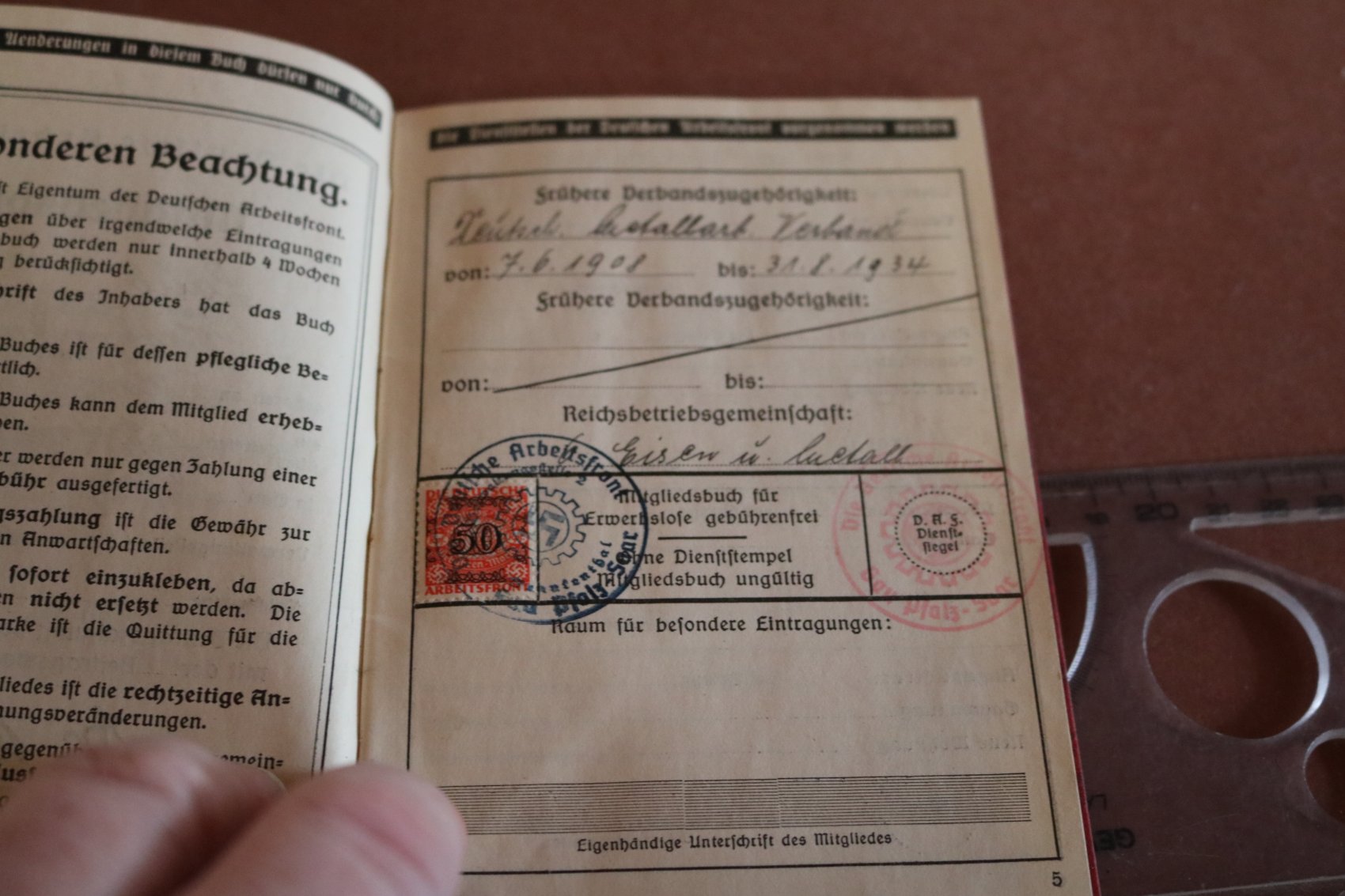 Mitgliedsbuch der Deutschen Arbeitsfront DAF eines Mannes aus Pfalz-Saar