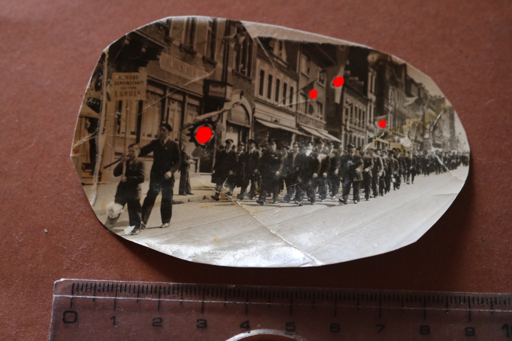 altes Foto - Marsch der Betriebsgemeinschaft der Firma E- gross - DAF Fahnen - Ort ?