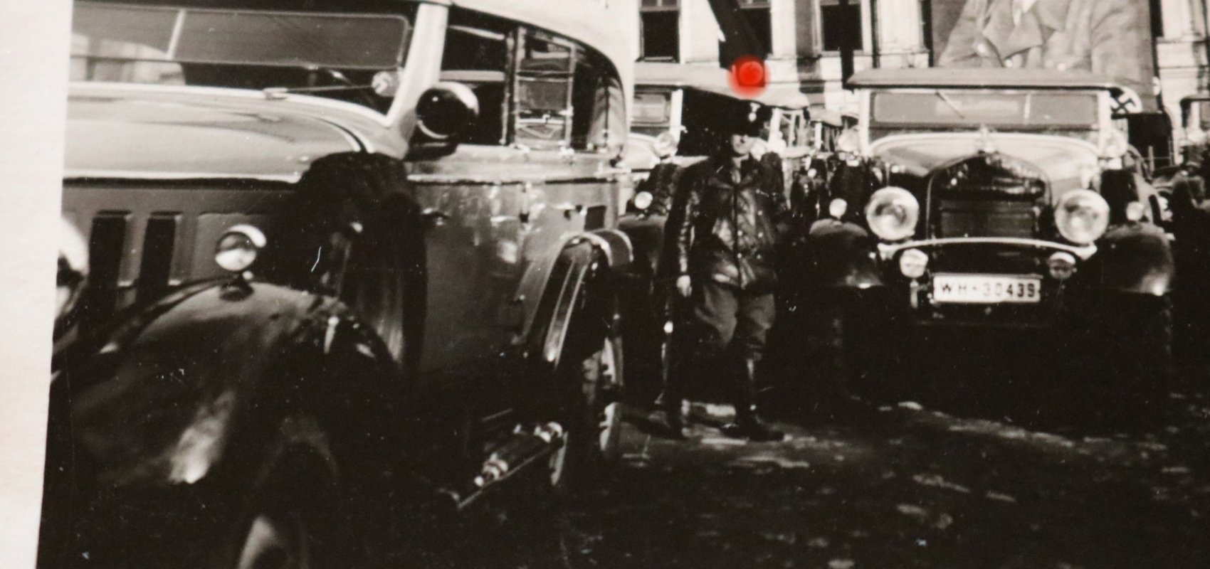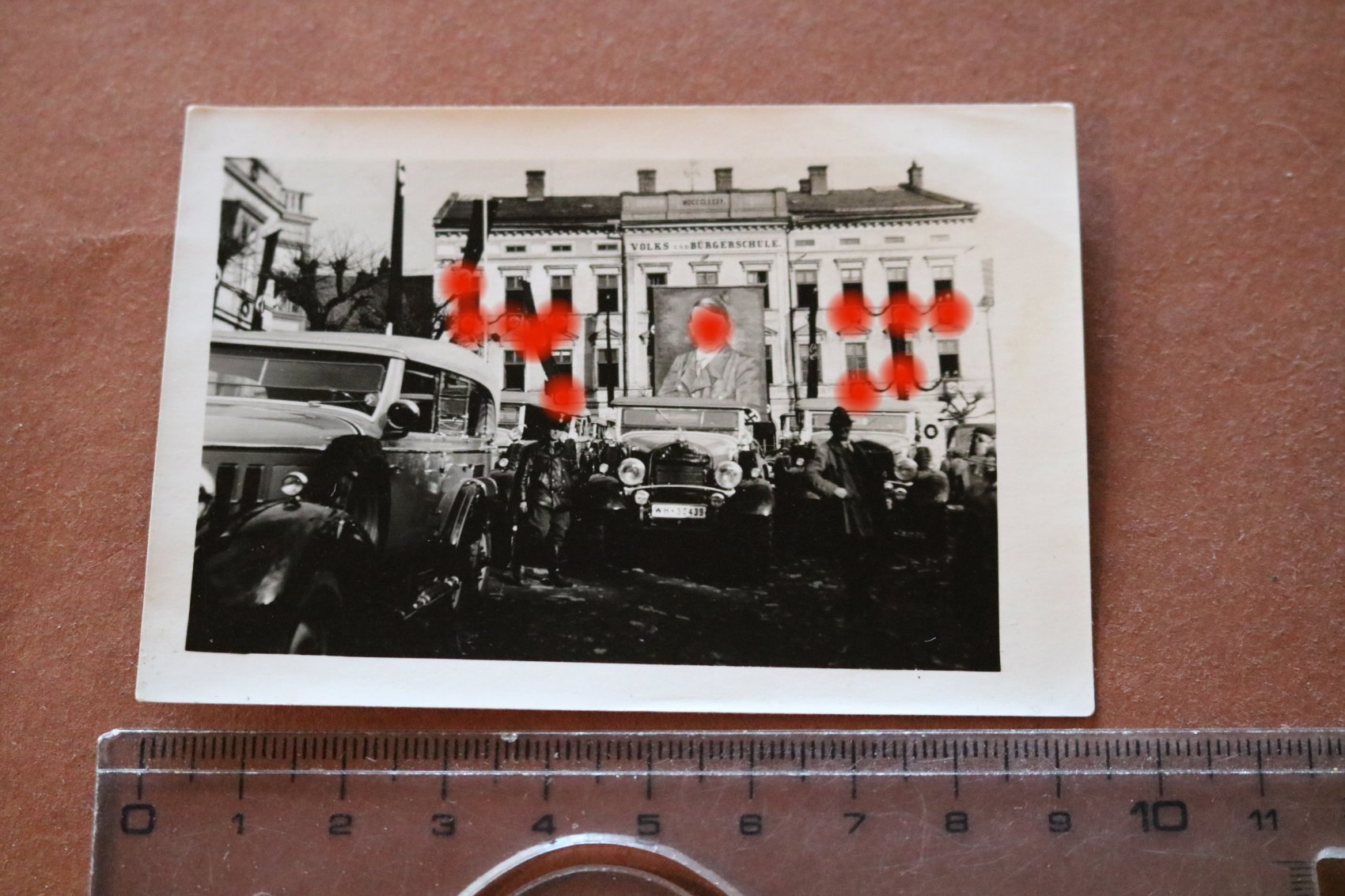 Mobile Preview: altes Foto - Wien ???  Volks.-und Bürgerschule - riesiges Adolf Hitler Plakat