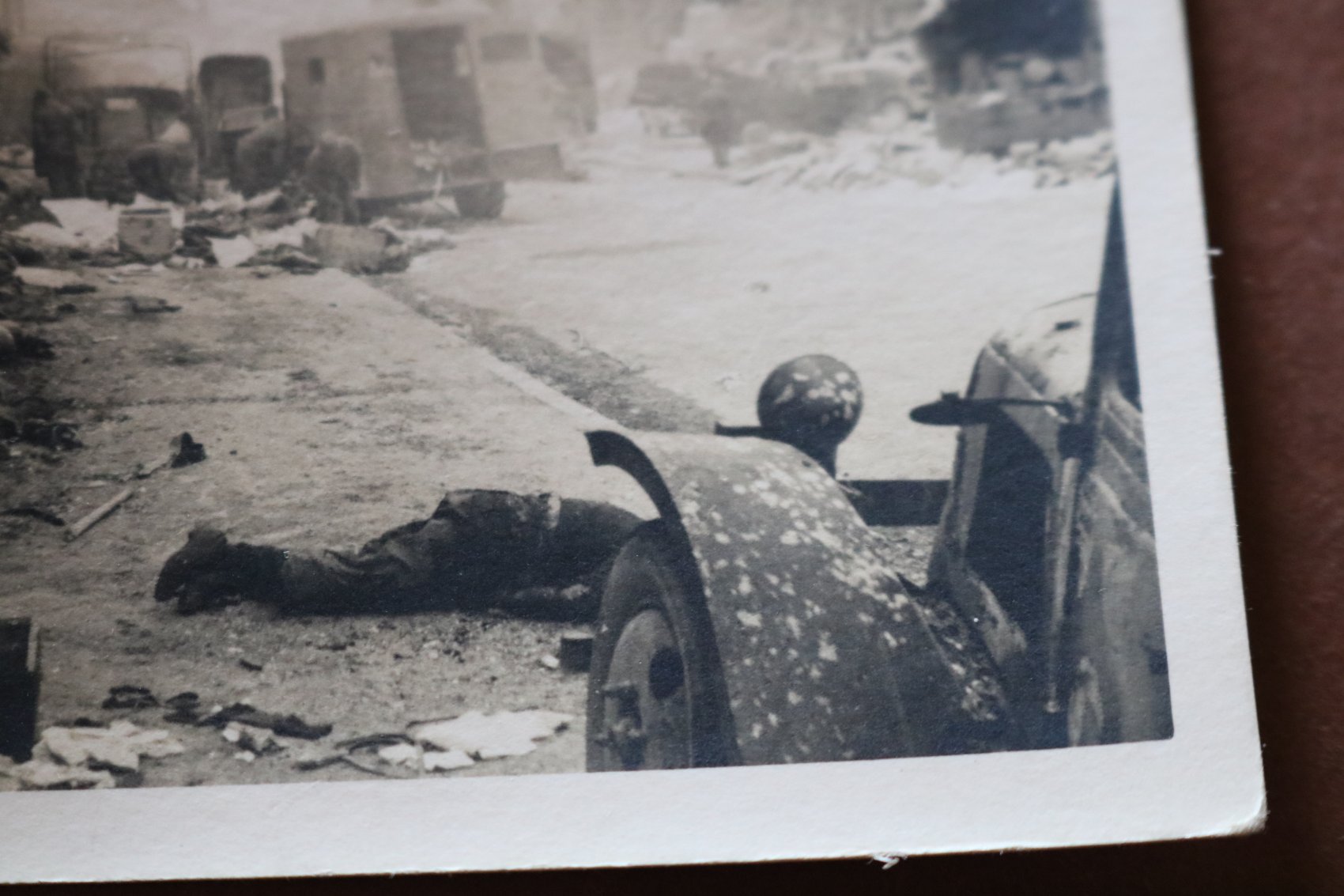 Preview: altes Foto - zerstörte Fahrzeuge , gefallene Soldaten nach Angriff - Ort ?? Westfeldzug