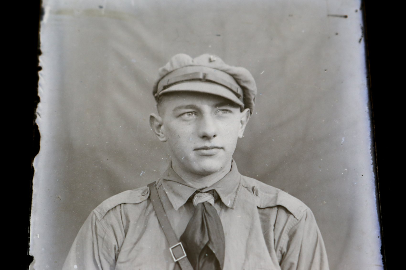 altes Glasnegativ - Hitlerjunge, Pimpf , mit Schirmmütze