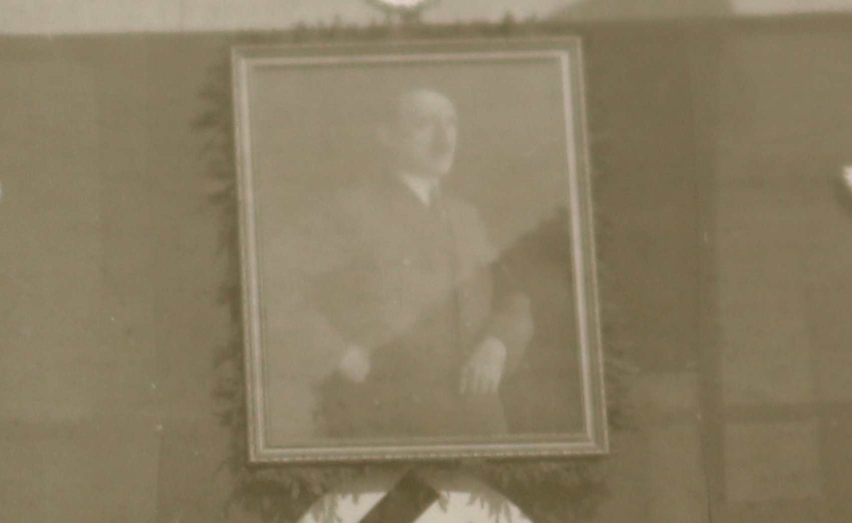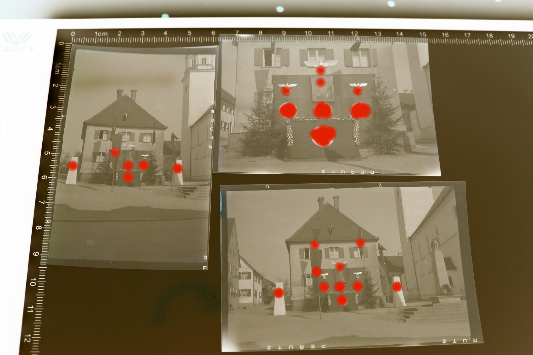 drei alte Negative - Podium mit Hakenkreuzfahnen im Ort aufgebaut