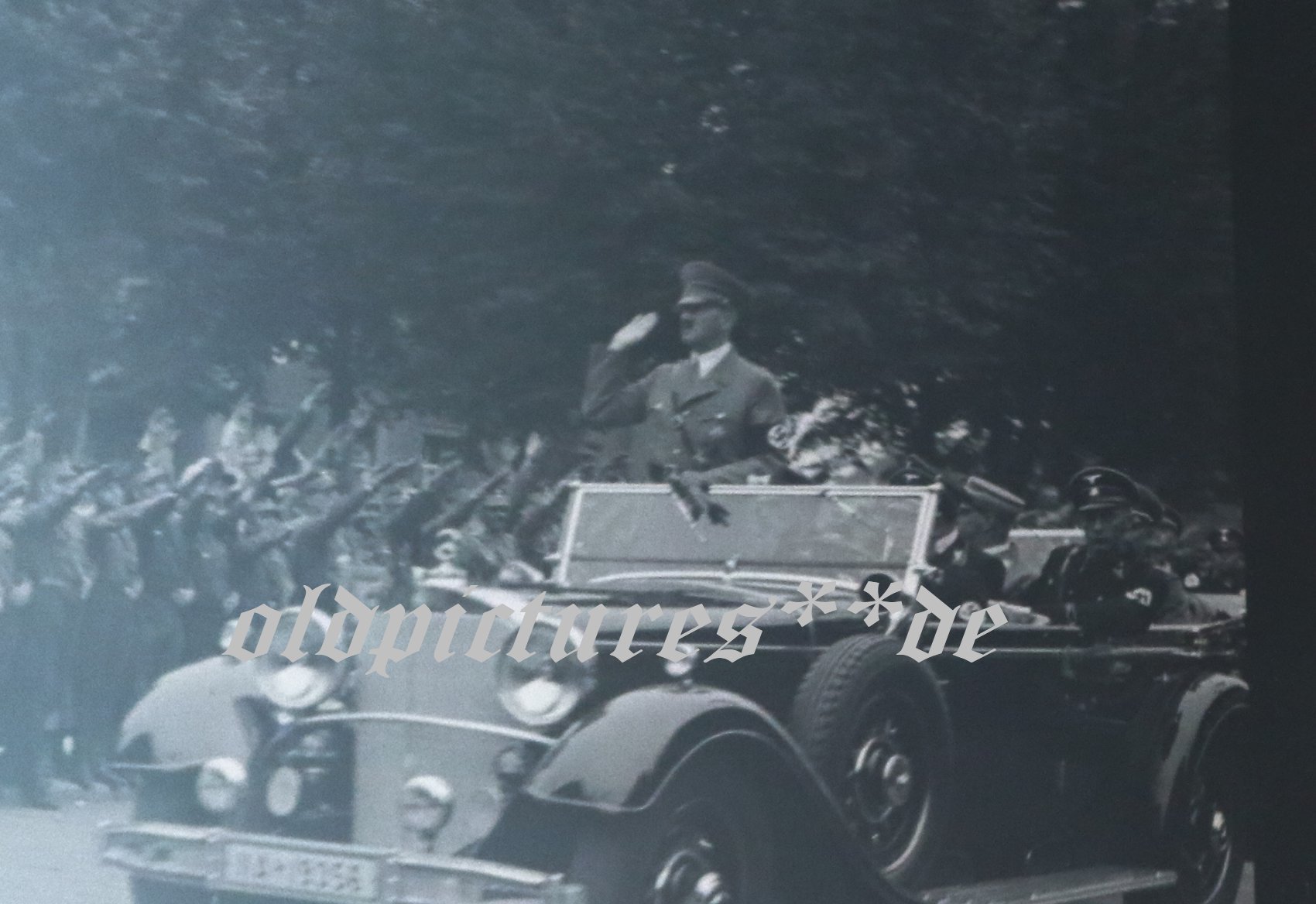 two snapshots including negatives - Adolf Hitler drives through town - 1936 - Olympic flag
